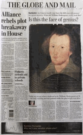 ""Shakspere - This Likeness taken 1603, Age at that time 39 ys.". As there are only two images of Shakespeare with any claim to authenticity, the announcement of the Canadian portrait brought international attention to this picture. Initial testing indicated that the frame, the paint, and style was consistent with a 17th century picture and that no retouching of a previous picture was discovered. However, reports are preliminary and, although they indicate the picture is not a fake, the initial tests don’t prove the person in the portrait is actually William Shakespeare.WARNING: THE WORLD WANTS TO BE FOOLED
